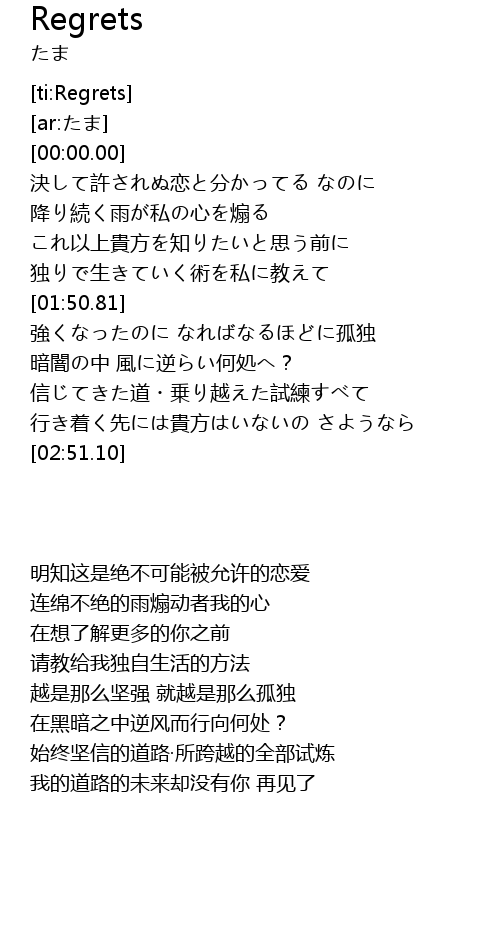 | [02:39.94] | 行き着く先には貴方はいないの さようなら |