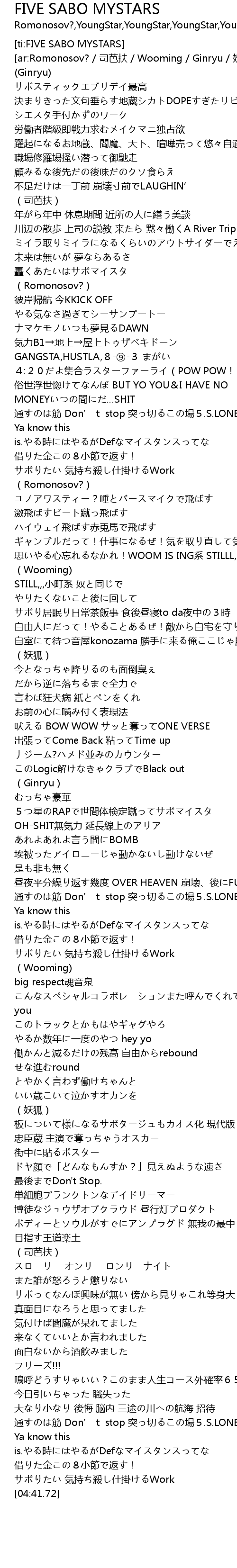 | [02:41.52] | むっちゃ豪華 5つ星のRAPで世間体検定蹴ってサボマイスタ |