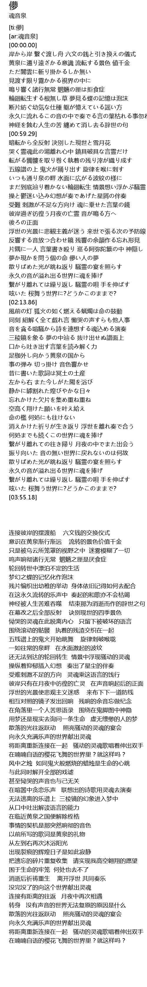 | [00:45.83] | 輪廻転生する根無し草 夢見る蝶の記憶は泡沫 |