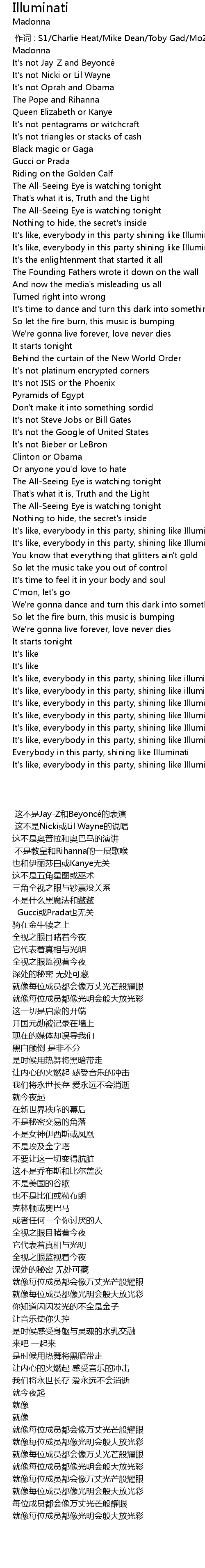 | [00:35.11] | It' s like, everybody in this party shining like Illuminati |
