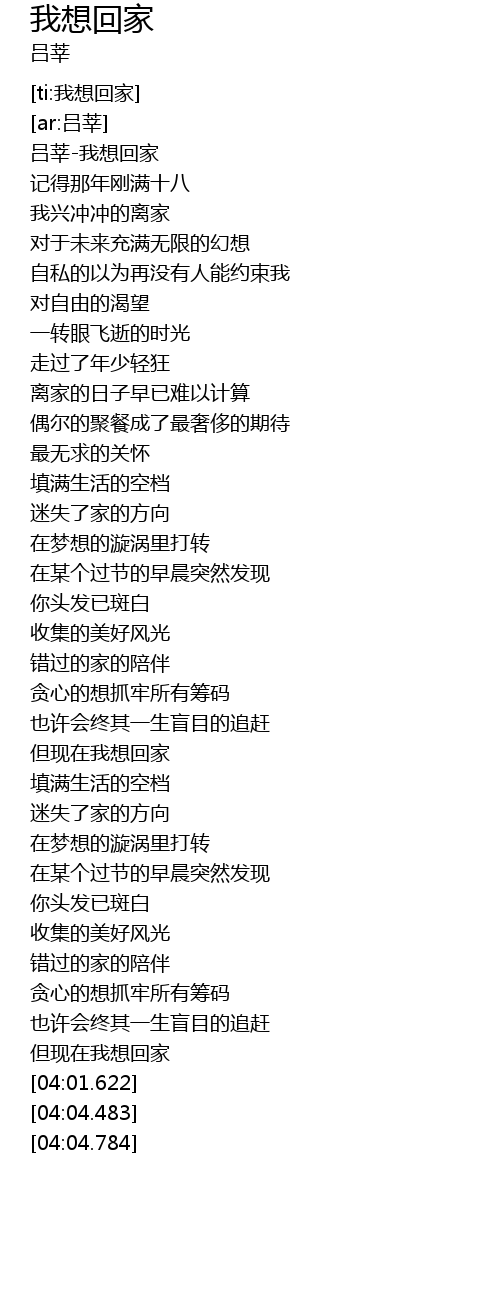 | [00:01.425] | lǚ shēn wǒ xiǎng huí jiā |