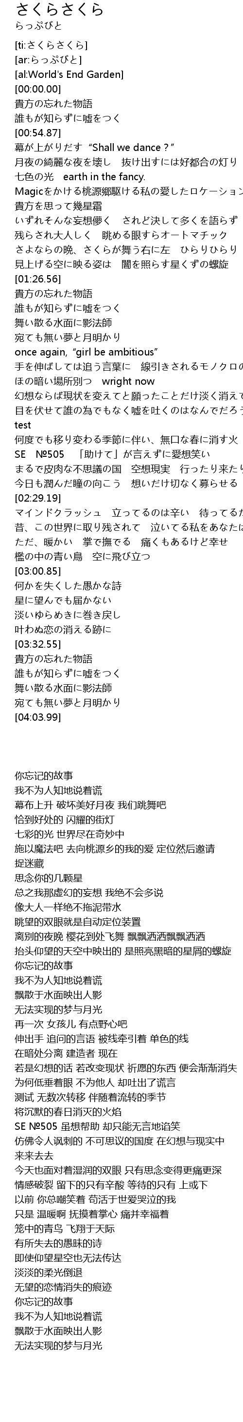 | [01:18.78] | さよならの晩、さくらが舞う右に左 ひらりひらり |