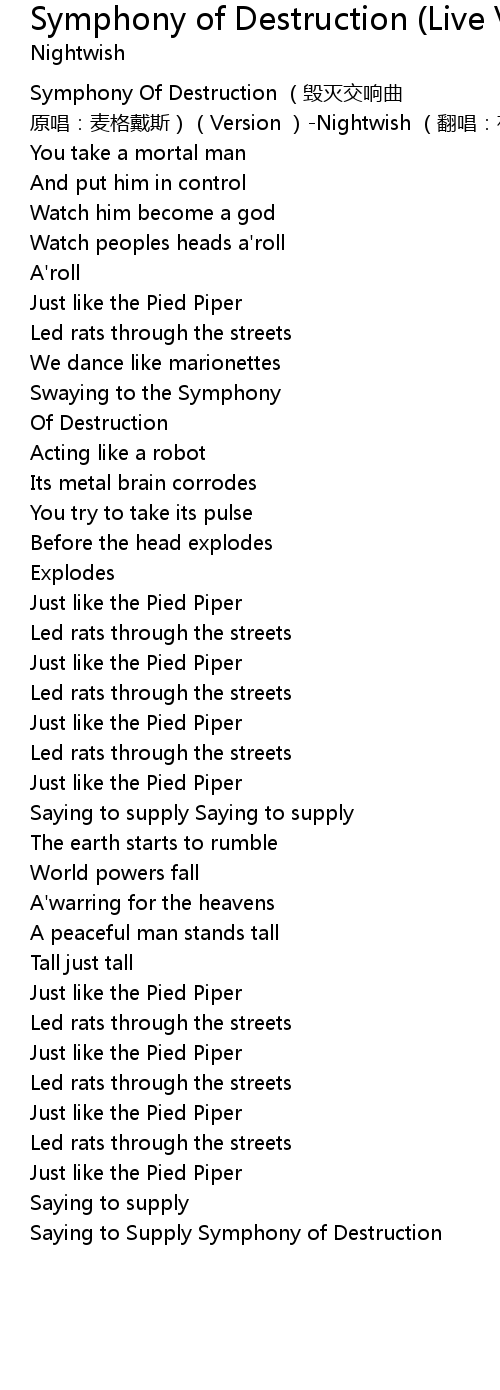 | [00:00.00] | Symphony Of Destruction (毁灭交响曲 原唱:麦格戴斯)(Version )-Nightwish (翻唱:夜愿) |
