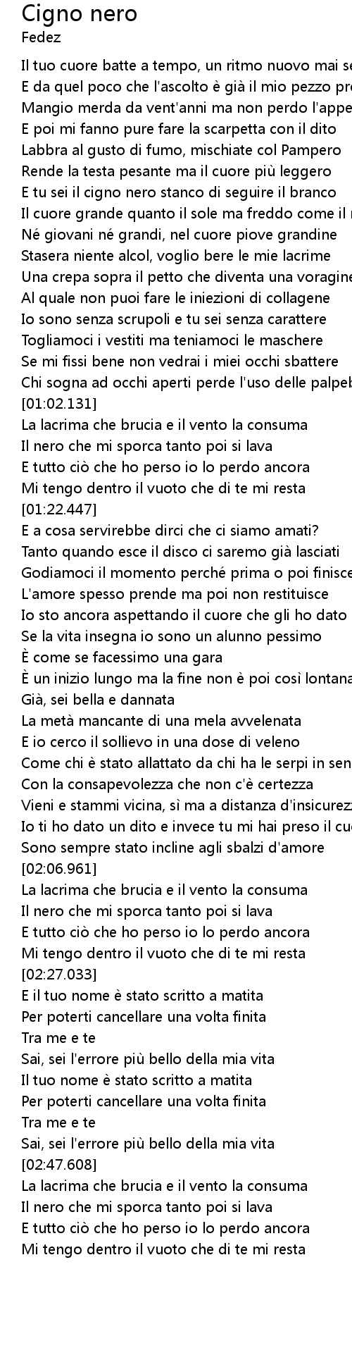 | [00:36.795] | E tu sei il cigno nero stanco di seguire il branco |