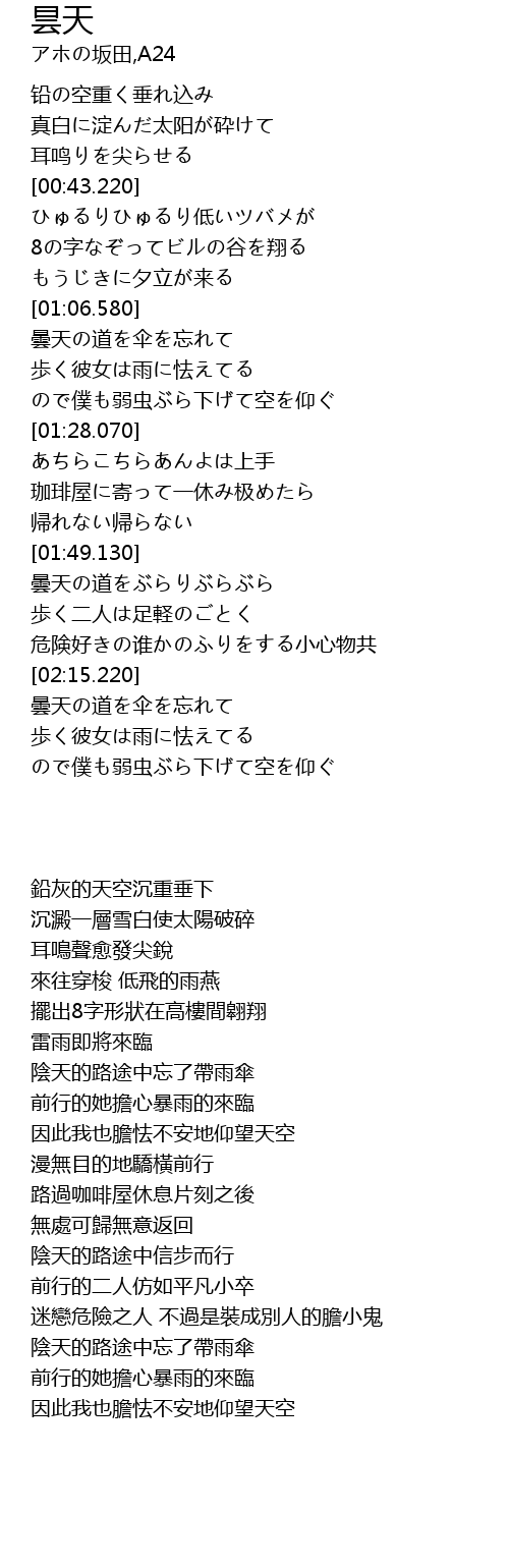 | [01:51.930] | 曇天の道をぶらりぶらぶら |