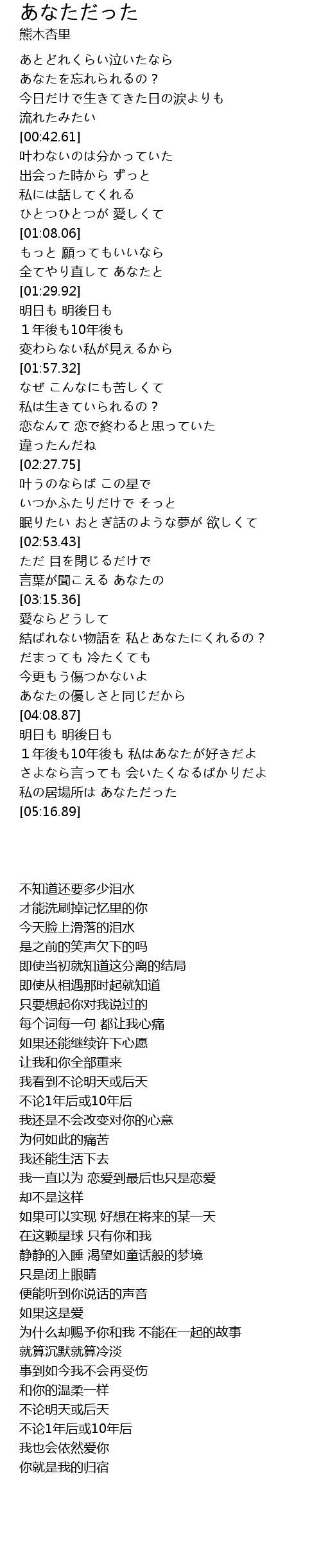 | [04:31.63] | 1年後も10年後も 私はあなたが好きだよ |