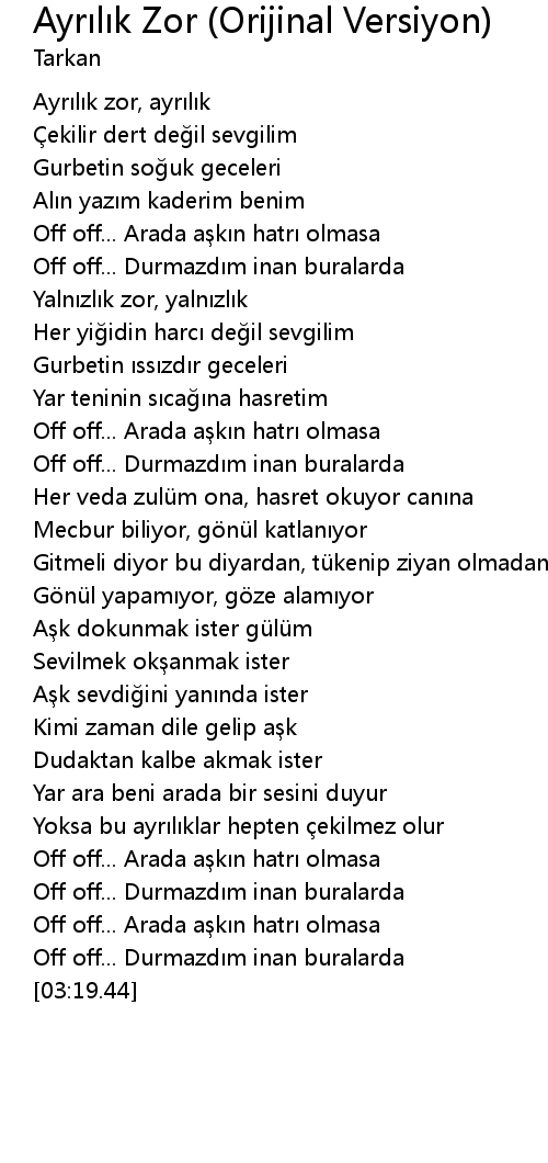 | [00:28.67] | Ayr l k zor, ayr l k |