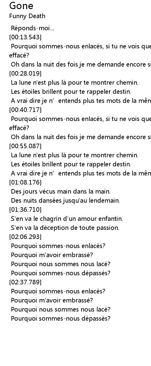 | [00:43.105] | Pourquoi sommesnous enlace s, si tu ne vois que l' ombre d' un efface? |