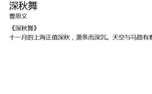| shí yī yuè de shàng hǎi zhèng zhí shēn qiū, xiāo tiáo ér shēn chén. tiān kōng yǔ mǎ lù yǒu zhe shēn suì de sè cǎi, xiàng bèi jǐng bù yí yàng, ér piāo líng de shù yè zài zhè kuài huà bù shàng yōu yǎ de wǔ dǎo zhe. wǒ yòng wǒ de yīn yuè, lái miáo huì zhè fú shēn qiū de měi jǐng. |