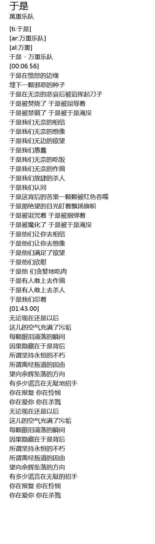 | [00:00.30] | 于是 - 万重乐队 |