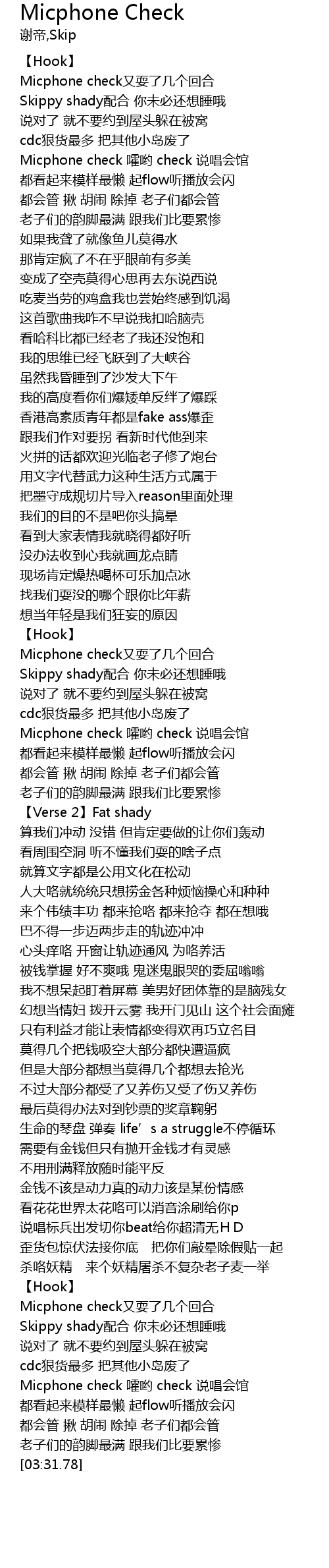 | [03:19.91] | Micphone check 嚯哟 check 说唱会馆 |