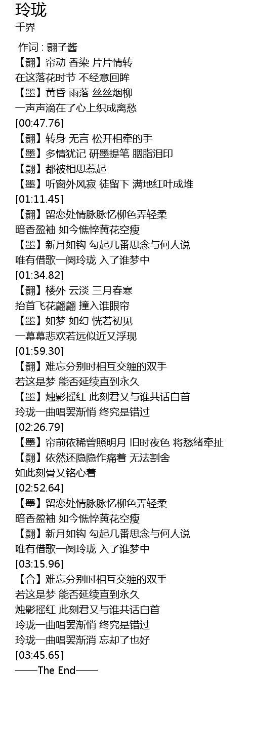 | [02:19.31] | 玲珑一曲唱罢渐悄 终究是错过 |