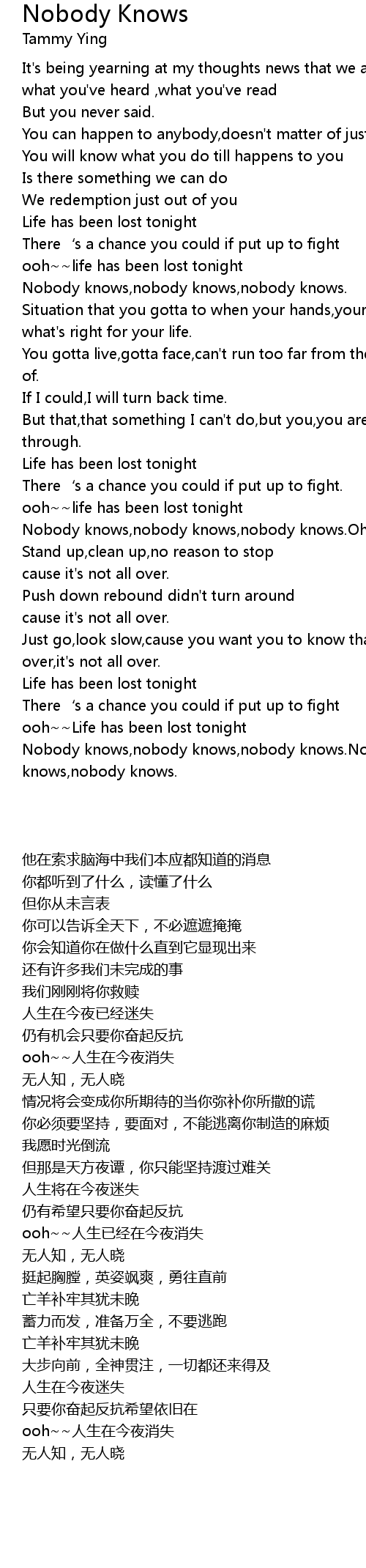 | [02:48.000] | Nobody knows,nobody knows,nobody knows.Nobody knows,nobody knows,nobody knows. |
