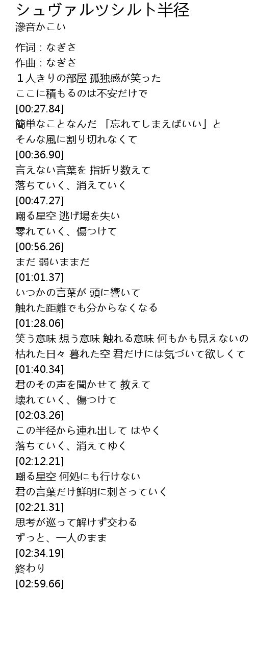 | [01:32.41] | 枯れた日々 暮れた空 君だけには気づいて欲しくて |