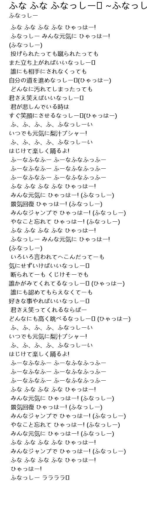 | [02:31.936] | ふ、ふ、ふ、ふ、ふなっしーい はじけて楽しく踊るよ! |