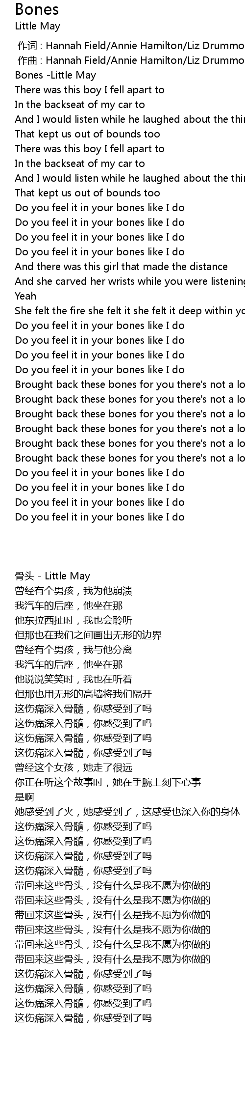 | [03:08.486] | Brought back these bones for you there' s not a lot that I wouldn' t do |