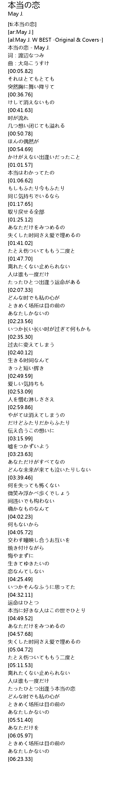 | [05:24.87] | たったひとつ出逢う本当の恋 |