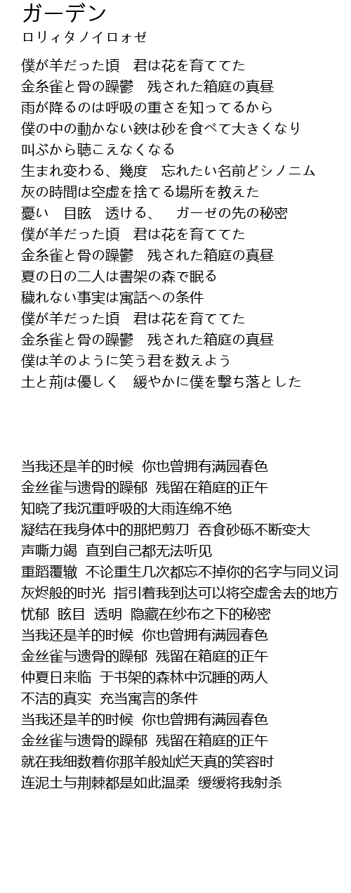 | [00:33.90] | 金糸雀と骨の躁鬱 残された箱庭の真昼 |