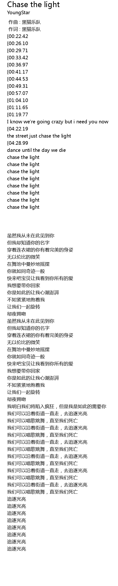 | [04:36.52][04:22.19][04:06.79][03:52.61][03:37.34][03:22.94] | We could walk along the street just chase the light |