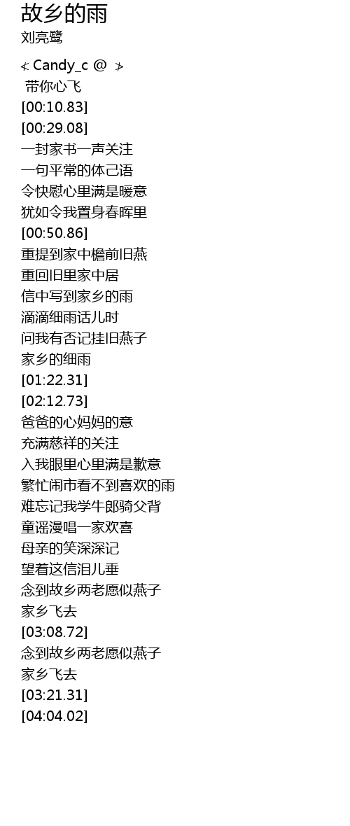 | [02:58.48] | 念到故乡两老愿似燕子 |