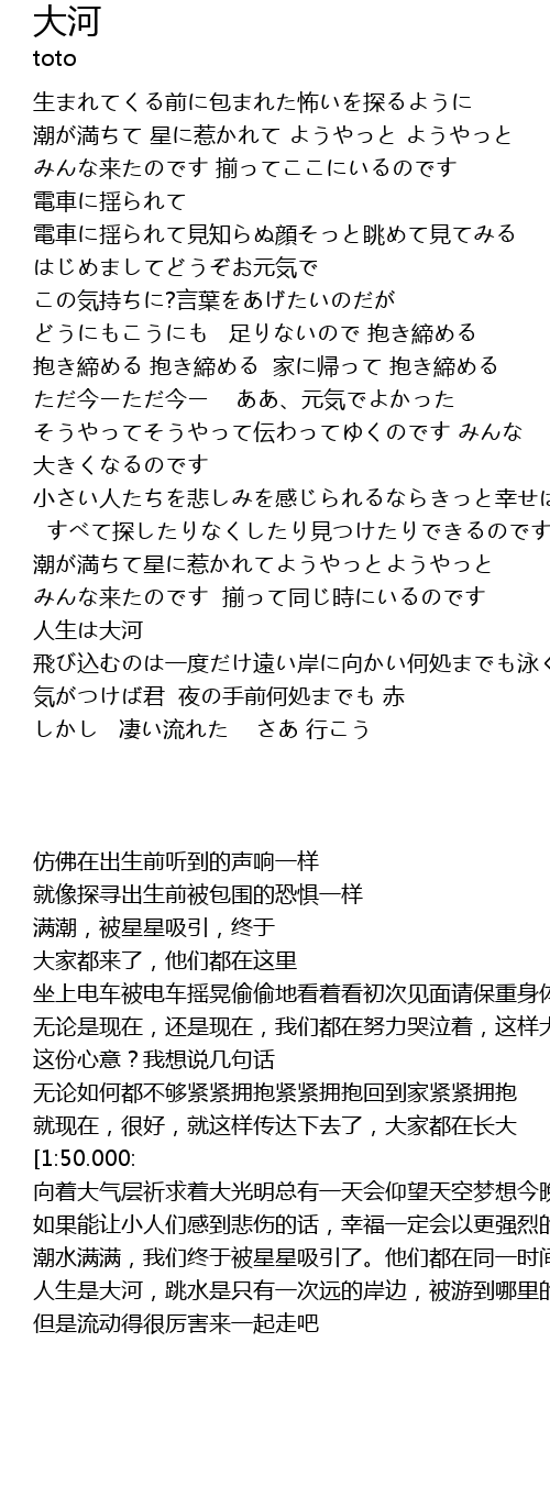 | [2:37.211] | 人生は大河 飛び込むのは一度だけ遠い岸に向かい何処までも泳ぐ指に絡まれは珊瑚 気がつけば君 夜の手前何処までも 赤 |