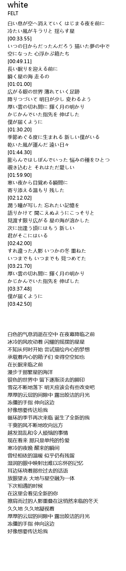 | [00:20.80] | 白い息が空へ消えていく はじまる夜を前に |