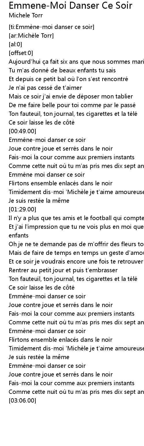 | [01:10.00] | Emmè ne moi danser ce soir |