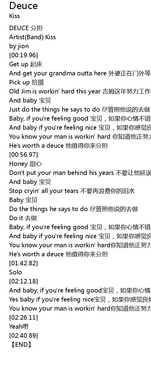 | [01:41.88] | He's worth a deuce 他值得你来分担 |