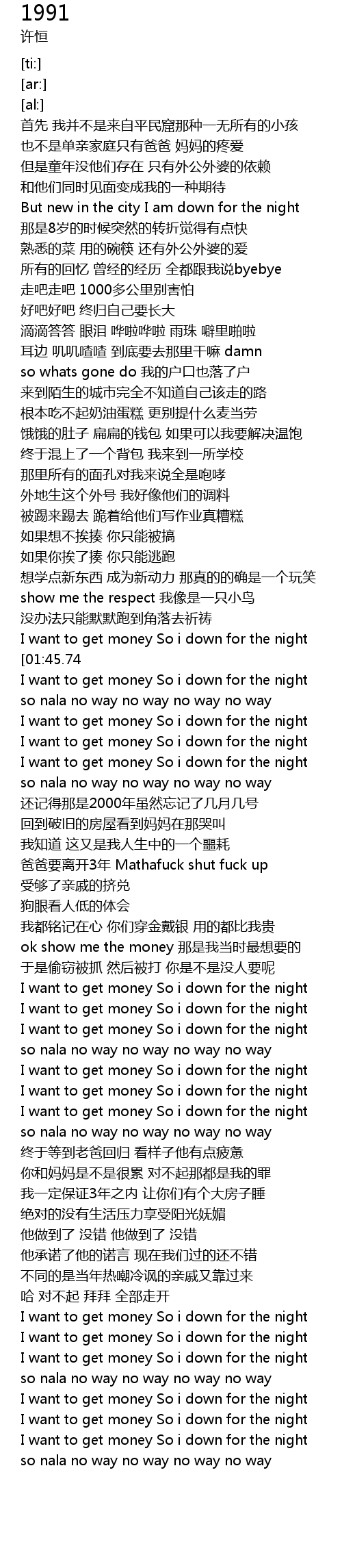 | [01:44.08][01:45.74] | I want to get money So i down for the night |