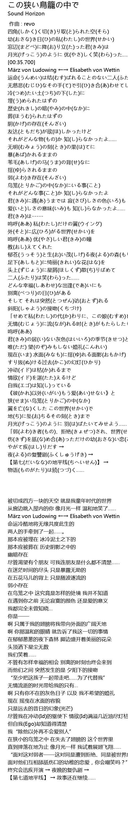 | [05:01.260] | 狭(せま)い鸟笼(とりかご)の中(なか) 翼を亡(な)くした この世界(せかい)で |