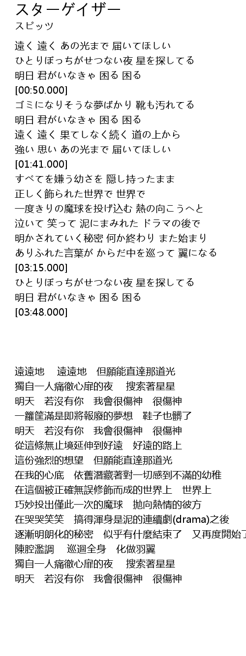 | [00:32.300] | ひとりぼっちがせつない夜 星を探してる |