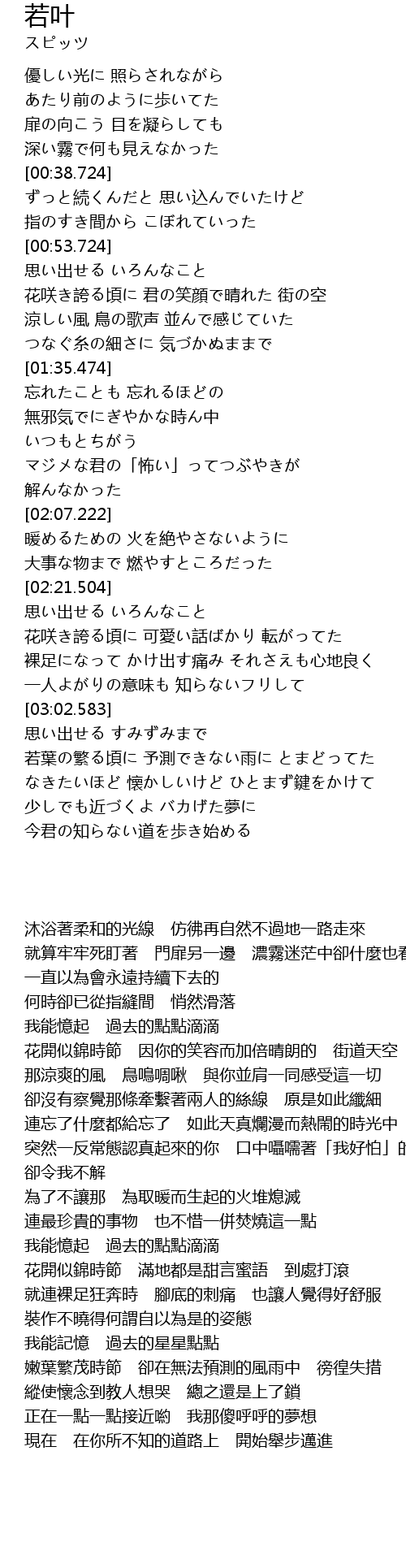 | [03:26.466] | 若葉の繁る頃に 予測できない雨に とまどってた |