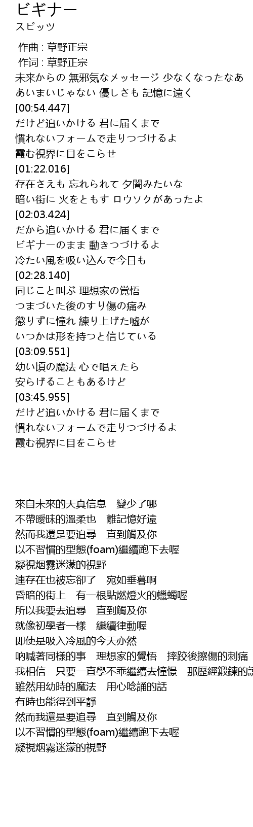 | [02:13.422] | ビギナーのまま 動きつづけるよ |