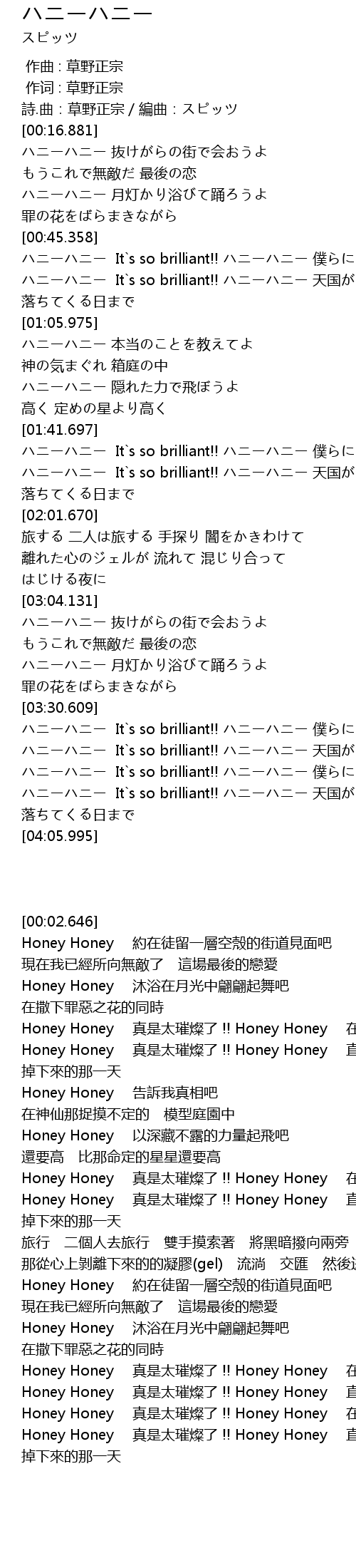 | [03:32.376] | ハニーハニー It`s so brilliant!! ハニーハニー 僕らに |