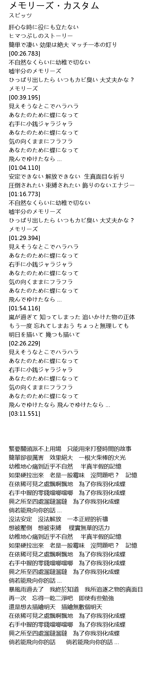 | [02:44.886] | 右手に小銭ジャラジャラ あなたのために蝶になって |