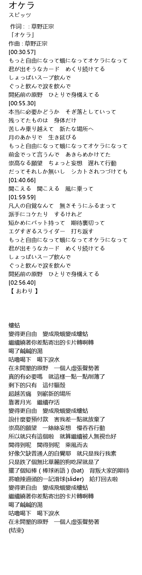 | [00:32.57] | もっと自由になって蛾になってオケラになって |