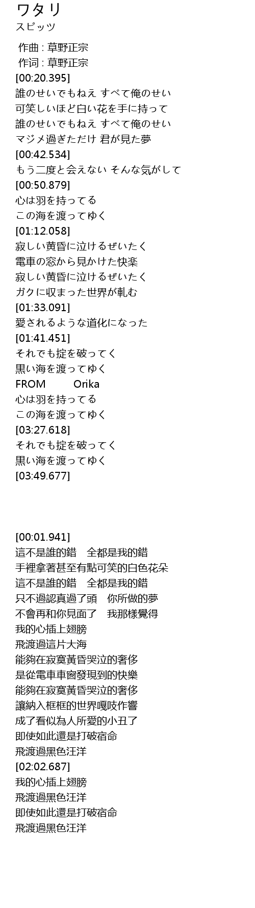 | [00:32.084] | 誰のせいでもねえ すべて俺のせい |