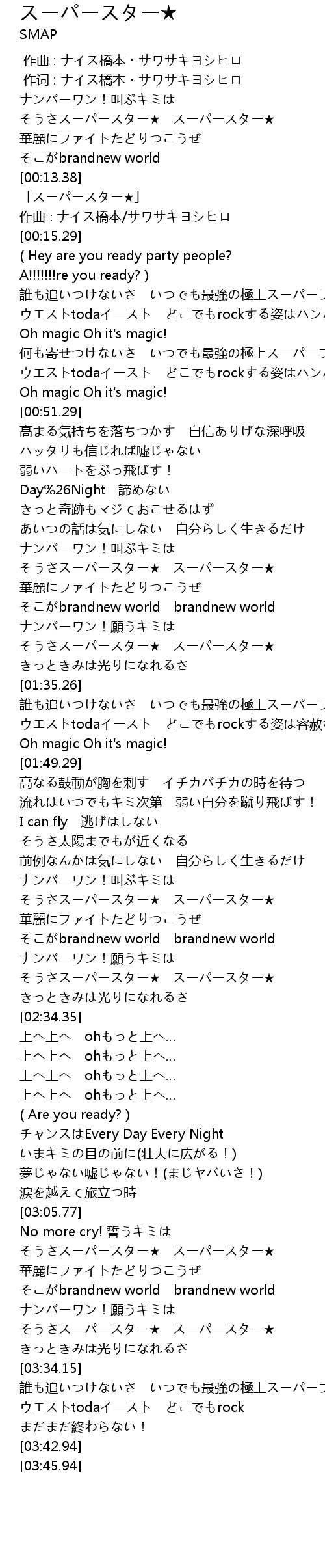 | [03:09.69] | そうさスーパースター★ スーパースター★ |