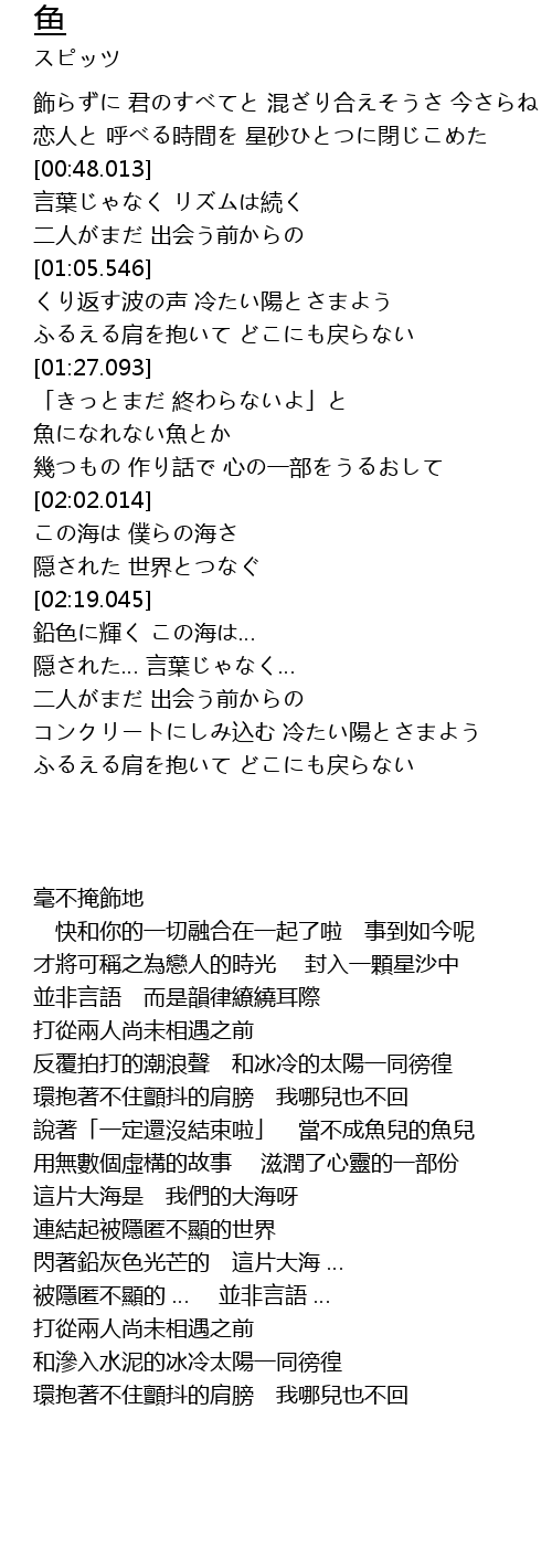 | [01:27.294] | 「きっとまだ 終わらないよ」と 魚になれない魚とか |