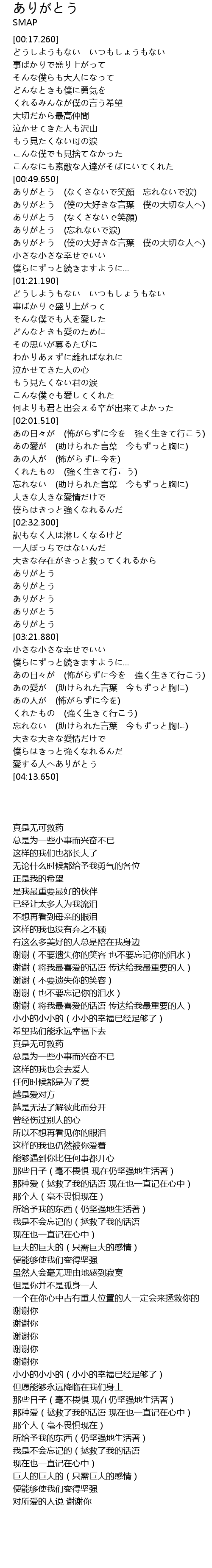 | [00:50.180] | ありがとう (なくさないで笑顔 忘れないで涙) |