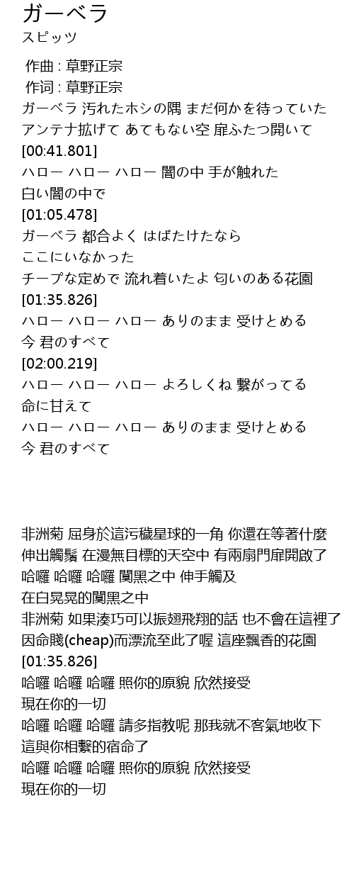 | [00:15.169] | ガーベラ 汚れたホシの隅 まだ何かを待っていた |