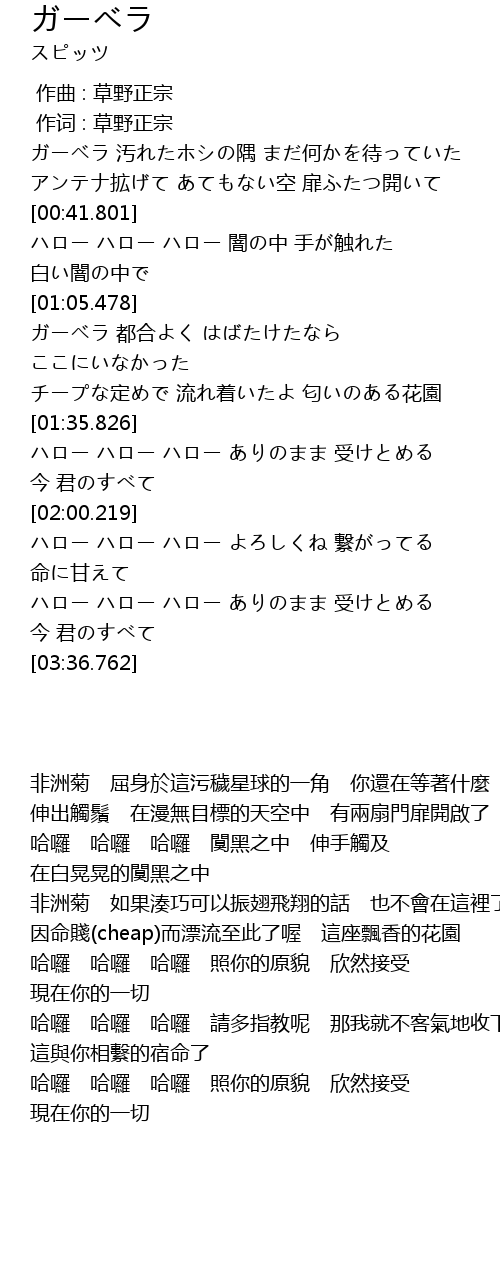| [00:15.169] | ガーベラ 汚れたホシの隅 まだ何かを待っていた |