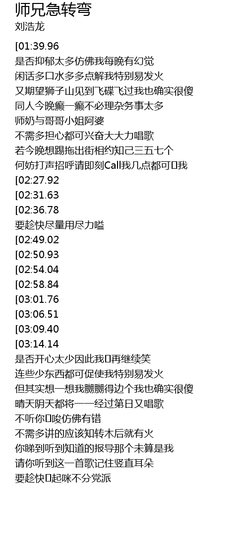 | [00:11.31][01:39.96][03:21.68][04:14.70] | liú hào lóng shī xiōng jí zhuǎn wān yuè |
