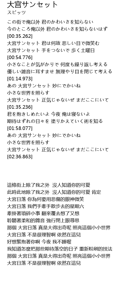 | [00:35.431] | 大宮サンセット 君は何故 悲しい目で微笑む |