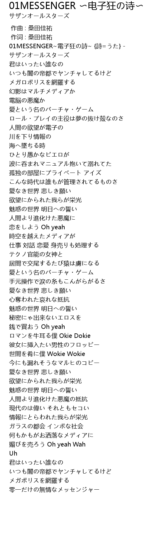 | [00:00.093] | 01MESSENGER~電子狂の詩~ {詩=うた} - サザンオールスターズ |