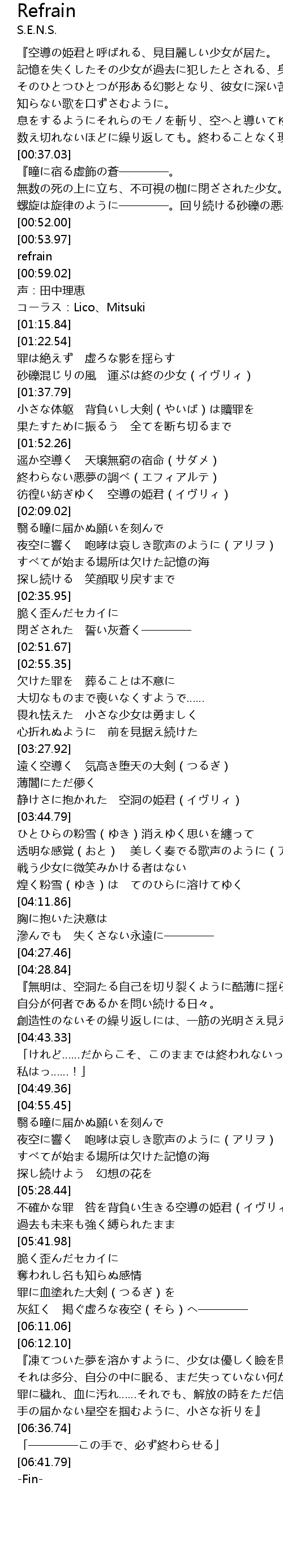 | [00:46.44] | 螺旋は旋律のように————。回り続ける砂礫の悪夢(エフィアルデス)』 |