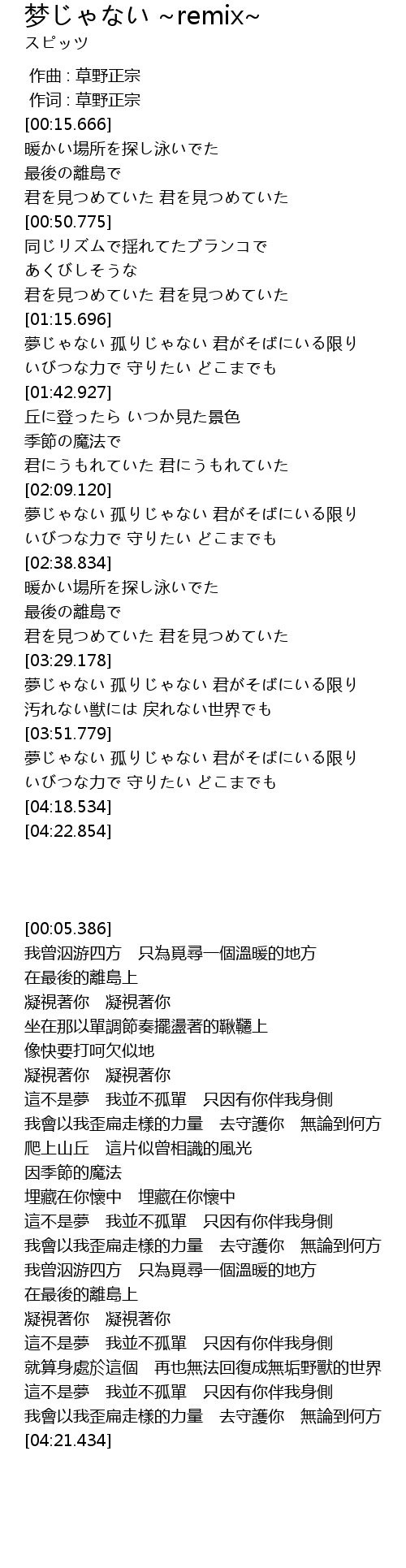 | [03:52.093] | 夢じゃない 孤りじゃない 君がそばにいる限り |