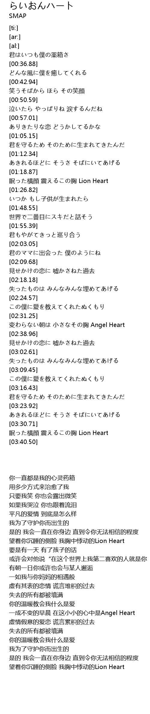 | [01:20.50] | 眠った横顔 震えるこの胸 Lion Heart |