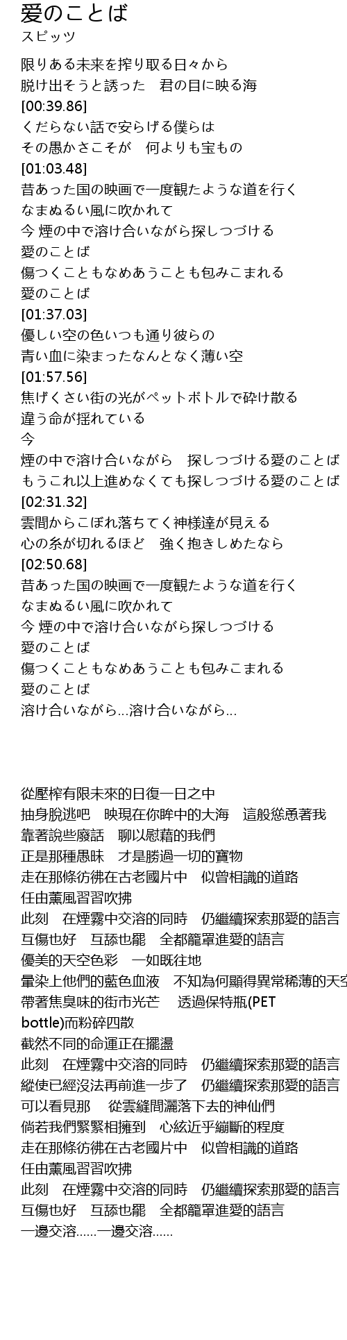 | [02:21.73] | もうこれ以上進めなくても探しつづける愛のことば |