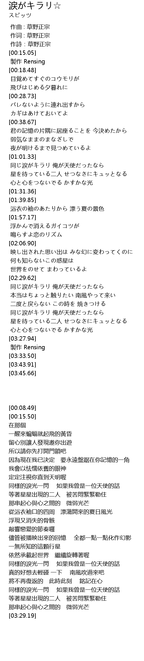 | [00:01.00] | 作词 : 草野正宗 |